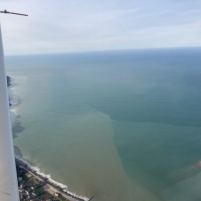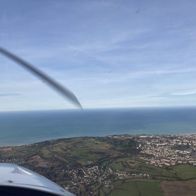 Le toucher au Tréport est un peu acrobatique en 05, avec une finale bordée d’arbres des deux côtés, je me pose un peu en crabe, pas loin d’une sortie de piste, remise des gaz, il est temps car la rangée d’arbres en face demande de prendre rapidement de l’altitude…